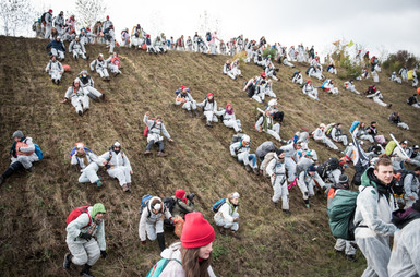 07:30 Uhr Aufstehen. Die Nacht war kalt, doch der warme Porridge der KüFa hilft uns über die morgendliche Müdigkeit hinweg. Wir machen uns auf zum Treffpunkt des goldenen Fingers, die Sonne steht kurz über dem Horizont. Sie wärmt uns an diesem Herbsttag und wirft ihr Licht auf die nun dampfenden Felder in der Umgebung. Immer mehr Menschen sammeln sich am Eingang des Camps und schon nach wenigen Minuten gehen wir los in Richtung des Braunkohletagebaus am Hambacher Forst. Wir schauen hinter uns und sehen tausende Menschen in weißen Maleranzügen mit Atemmasken im Gesicht und Strohballen unterm Arm. Die taz nennt uns „gute Außerirdische“, nicht ganz zu Unrecht könnte man bei diesem Anblick meinen. 6500 sind es! Wir laufen entlang von Gemüsefeldern und durch kleine Dörfer mit verwinkelten Straßen. Viele Anwohner*innen winken uns lächelnd und unterstützend zu, manch einer beschimpft uns. Wir spüren die Spaltung der Gesellschaft.